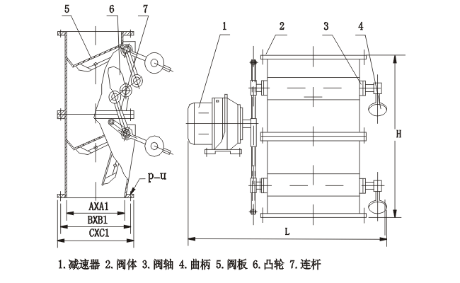 该阀又名锁风喂料机,普遍适用于建材、冶金、化工、电力等行业,作为各类除尘设备的灰斗卸料装置及各种磨种、烘干机、料仓等设备的给卸料装置,防止野风吹入。 结构特点 本系列阀门采用钢板焊接结构,连杆、曲柄传动机构,及自动复位机构,结构紧凑,工作平稳可靠。 工作原理: 由减速器带动传动杆通过曲柄、凸轮及连杆分别带动上、下两传动轴旋转,交互开启,通过配备的杠杆系统或拉伸弹簧,保证阀板可靠的复位,防止野风吹入,依确定的开闭频率完成系统的给卸料。